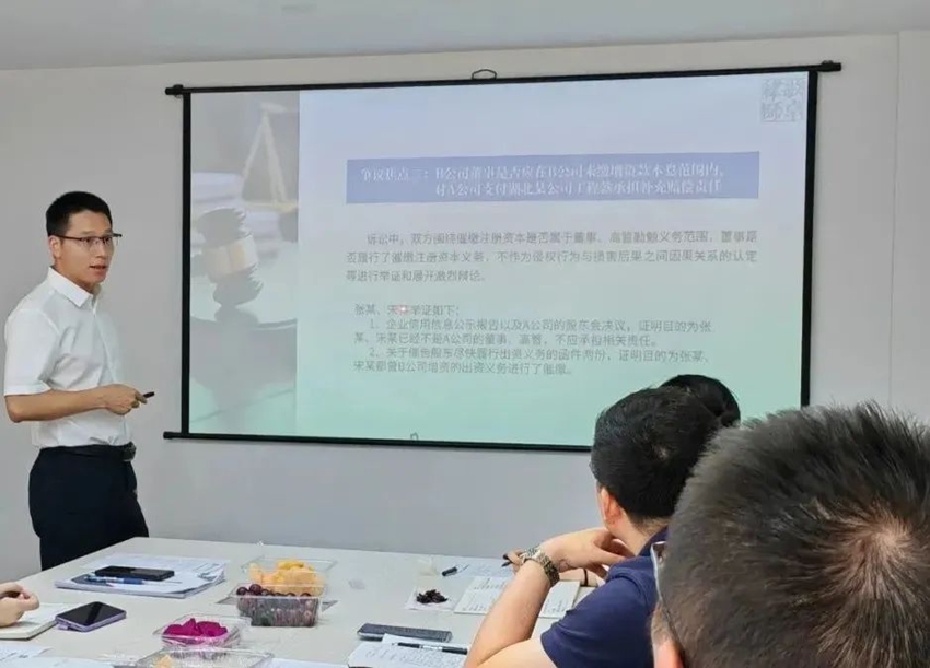茶歇之后,唐宾律师继续分享其承办案件精彩过程。经过缜密周全的前期准备、庭审中缜密的质证和说理,法院最终采纳了律师意见,一审判决①业主方A公司向客户湖北某公司支付工程款6200余万元,②股东B公司在未缴纳增资本息(约2000万元)范围内对A公司不能清偿的前述判项债务承担补充赔偿责任,③B公司董事对B公司的责任承担补充赔偿责任,取得了超出委托人预期的诉讼效果。