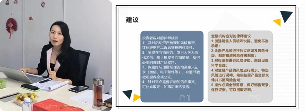 短暂茶歇之后,分享会进入下半场。邹佳律师围绕“违反适当性义务的判定标准和责任承担”进行讲解,从适当性义务的产生背景、内涵、性质和规则体系,到投资者损失的认定及数额、产品存续期间的分红款的处理等问题,通过详实的案例及深刻的总结为大家今后从事此类案件提供了非常有价值的参考。讲座的最后,邹律师还分别对投资者和金融机构提出了宝贵的建议。