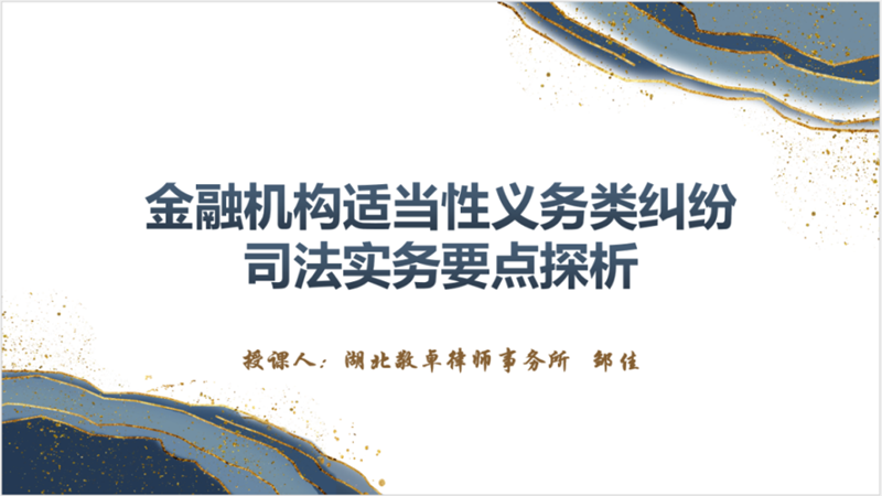 “节物风光不相待,桑田碧海须臾改。”湖北敬卓律师事务所紧跟社会发展变化,针对当前金融理财产品爆雷呈现高发态势,于2023年9月26日下午举办第十期敬卓讲坛,本次讲坛由敬卓所合伙人邹佳律师主讲,主题为《金融机构适当性义务类纠纷司法实务要点探析》。