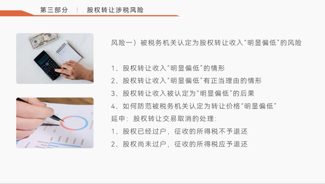 赵洁律师首先介绍了有关股权转让的基础知识,主要包括股权转让法律关系和涉及的税种与税率。紧接着,赵洁律师讲解了股权转让的涉税要点和涉税风险,她指出实践中对于涉税风险如“被税务机关认定为股权转让收入明显偏低” 的处理有很大争议,并列举了税务机关的通常做法,为各位律师提供参考。