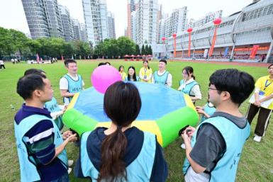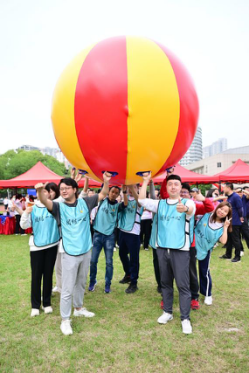 在“团结写作 众星捧月”项目中,队员们分别拉住充气鼓的10个把手,在两分钟内进行颠球计数。该项目不仅考验了身体的协调性,也展现了队员们的毅力和耐力。