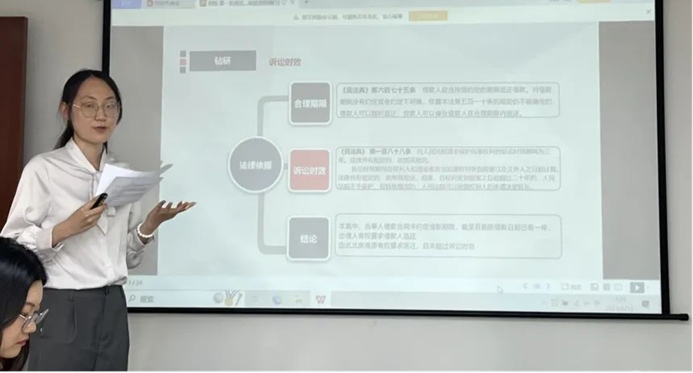 实习生黄怡昕借助逻辑清晰的汇报讲述了她在敬卓律师事务所实习的收获和成长。她在一个月内不仅接触了多类案件、撰写各类法律文书,而且在带教律师的带领下走入法院、仲裁院,接见当事人、为顾问单位提供法律意见。黄怡昕同学以一起名为借贷实为买卖的案件分享了如何运用思维导图分析案件,强调思维管理的重要性,让与会人员受益匪浅。